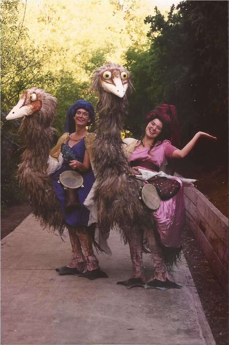 Roving resplendently on their Giant Emu companions, this exotic duo delighted audiences as they combined their elegant puppetry with buffoonery, subtlety with crassness! Elia and Esta enthralled and amazed with their daring feats of Emu Dancing. In their travels across the universe, Emu Nomads performed at many far out events including … Broome Pearl Festival, Oerol Festival (Netherlands), Gent Puppet and Buskers Street Theatre Festival, Glastonbury, Christchurch World Buskers Festival, Adelaide Fringe Festival, Melbourne Kingfisher Festival and the Auckland Teddy Bears Picnic.